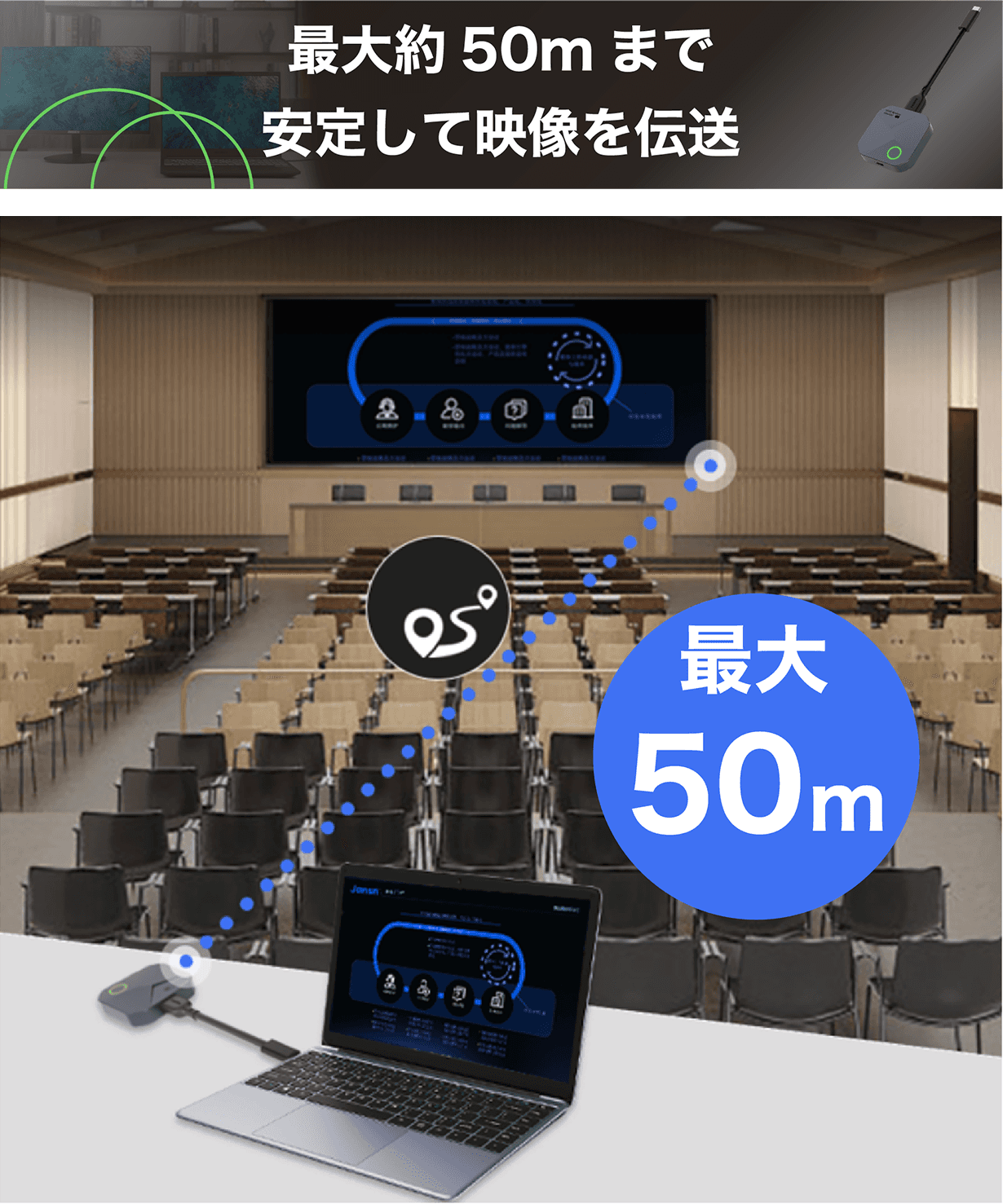 本製品は、見通しの良い環境下で最大約50メートルのワイヤレス伝送に対応。