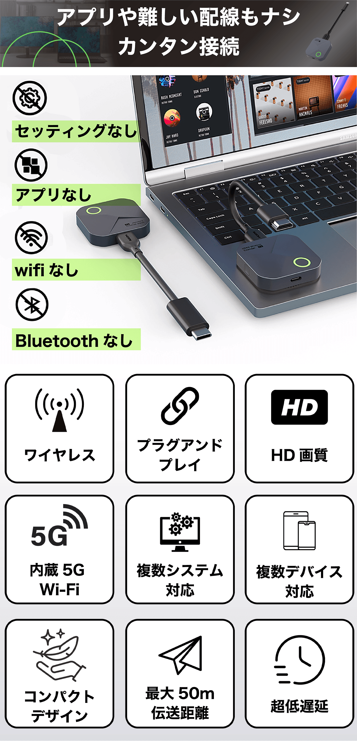 本製品は、プラグアンドプレイ対応のワイヤレスディスプレイキットです。