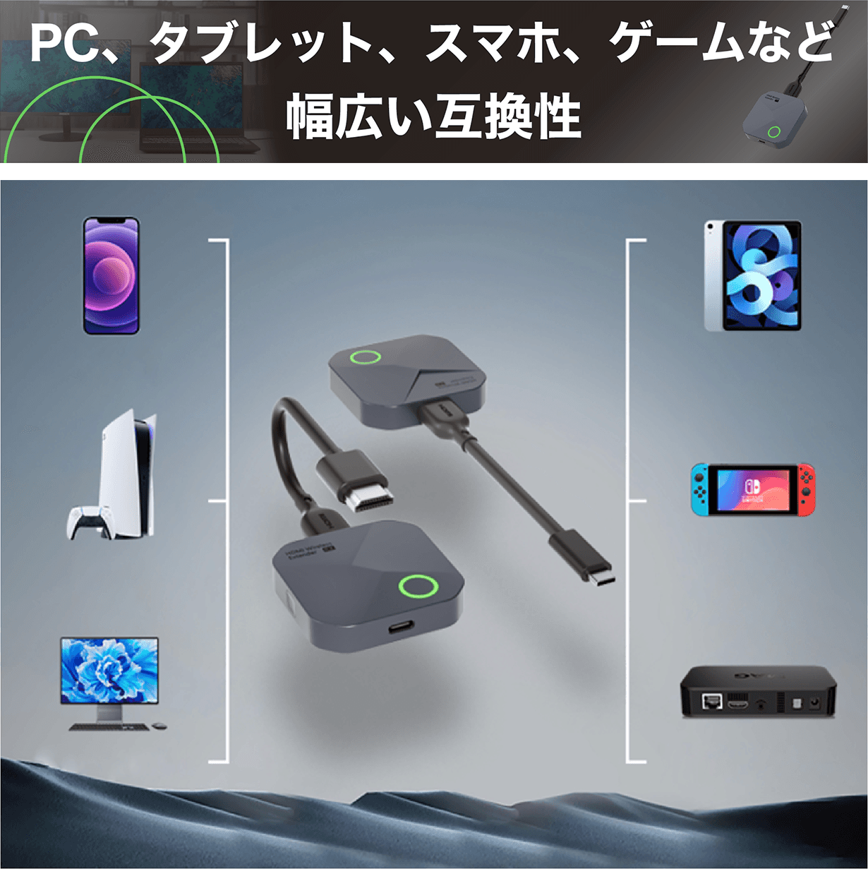 送信機をノートPC・ゲーム機・カメラなどのHDMI対応機器に接続し、受信機をテレビやモニターに挿すだけ。