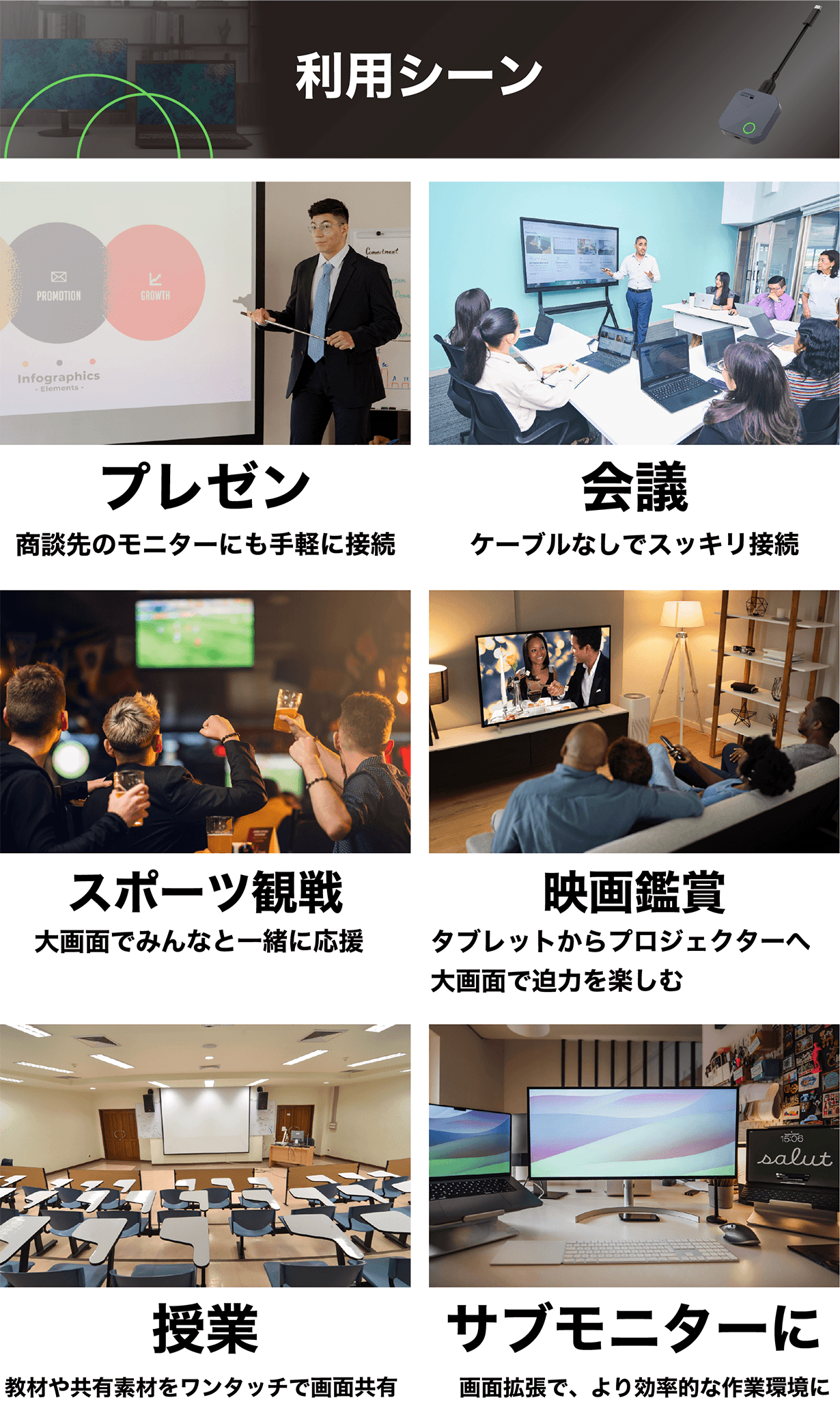 広めの会議室やイベント会場、展示スペースなどでも、ケーブルに縛られることなく